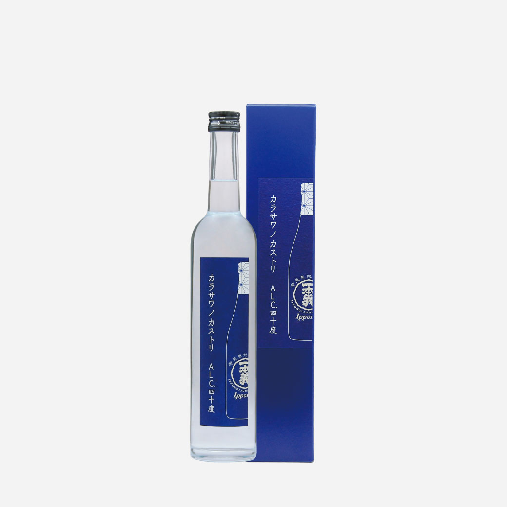 本格焼酎「カラサワノ カストリ」は、「一本義 辛爽系 純米吟醸」の酒粕のみを原材料として蒸留しました。